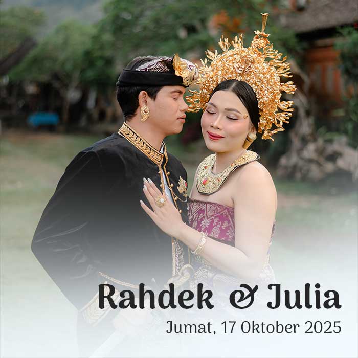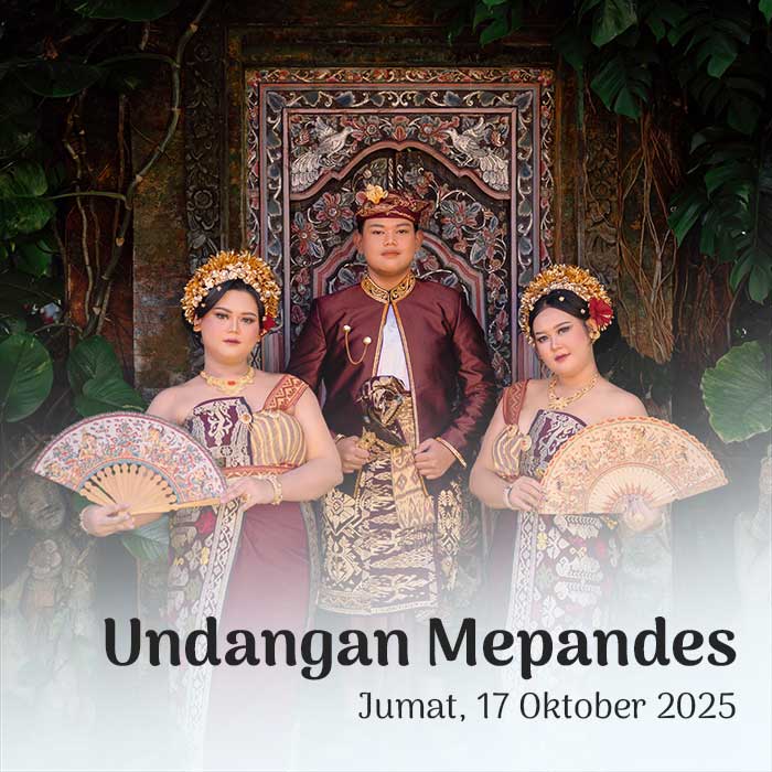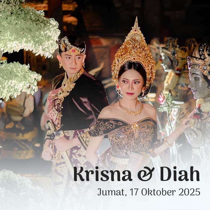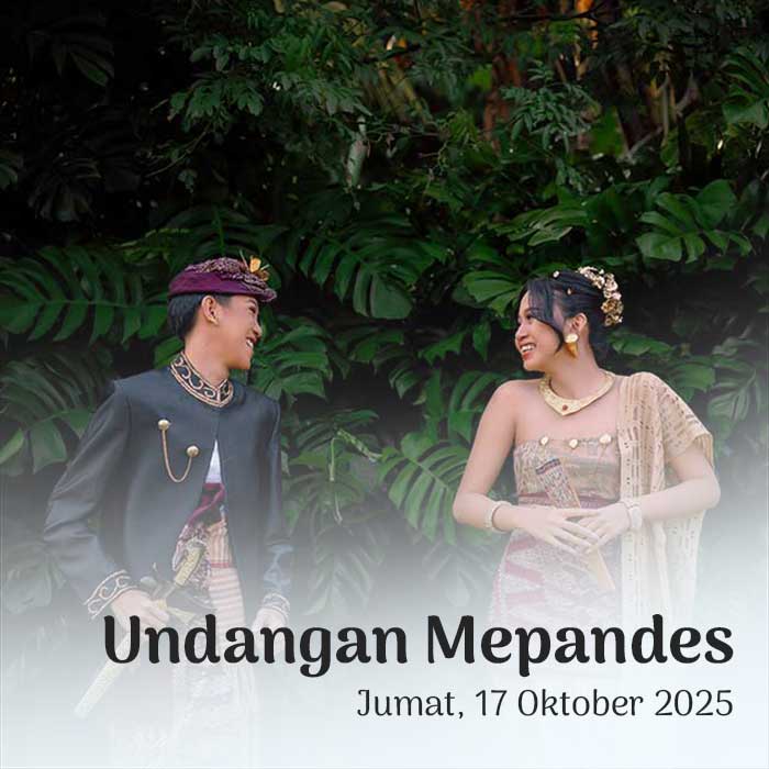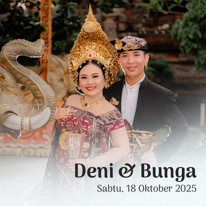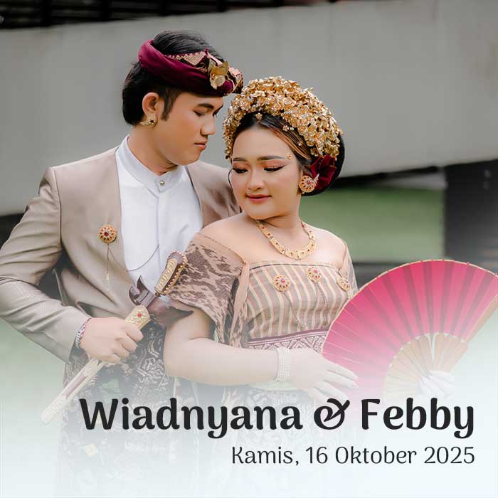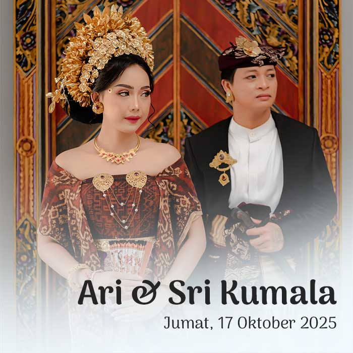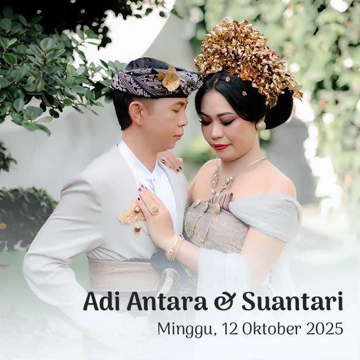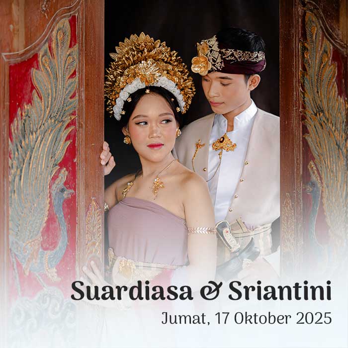 Suardiasa & Sriantini 17 Oktober 2025 Wahai pasangan suami-istri, semoga kalian tetap bersatu dan tidak pernah terpisahkan. Semoga kalian mencapai hidup penuh kebahagiaan, tinggal di rumah yang penuh kegembiraan bersama seluruh keturunanmu. (Rg Veda X.85.42) Menuju Hari Bahagia Menuju Hari Bahagia Hari Jam Menit Detik Saat Bahagia Save the Date Perkenalkan Kami Yang Berbahagia, Putra […]