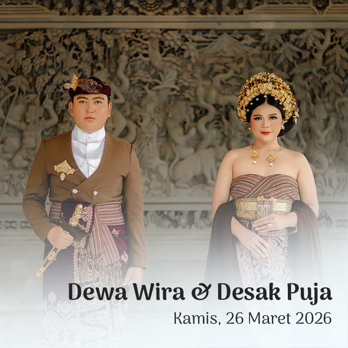 Dewa Wira & Desak Puja 26 Maret 2026 Wahai pasangan suami-istri, semoga kalian tetap bersatu dan tidak pernah terpisahkan. Semoga kalian mencapai hidup penuh kebahagiaan, tinggal di rumah yang penuh kegembiraan bersama seluruh keturunanmu. (Rg Veda X.85.42) Menuju Hari Bahagia Menuju Hari Bahagia Hari Jam Menit Detik Saat Bahagia Save the Date Perkenalkan Kami Yang