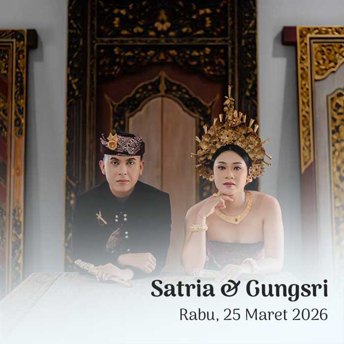 PAWIWAHAN Satria & Gungsri Rabu, 25 Maret 2026 Pawiwahan Satria & Gungsri Dear, Tamu Undangan Open Invitation Om Swastyastu Atas Asung Kertha Wara Nugraha Ida Sang Hyang Widhi Wasa/Tuhan Yang Maha Esa kami bermaksud mengundang Bapak/Ibu/Saudara/i pada Upacara Manusa Yadnya Pawiwahan (Pernikahan) Putra dan Putri kami Kadek Satria Permana Putra, S.Tra Putra kedua dari pasangan